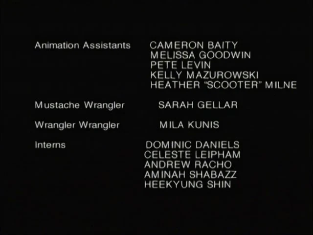 Most episodes contain fake, just-for-fun credits thrown in at the end. Sarah Michelle Gellar gets a credit every time (as Sarah Gellar) and usually Mila Kunis. Once, special credits were repeated in two consecutive season one episodes. A member of the crew is also sometimes name-checked. In season one, it was animator Shannon Gold. Season 2 saw editor Garret Elkins singled out. Season 3's honoree is effects artist Matt Peake. Digital effects artist Andrew Racho was called upon for Robot Chicken: Star Wars Episode II and Season 4. Robot Chicken: Star Wars Episode III and Season 5 target visual effects artist Cam Leeburg. Season 6 targets visual effects artist Brian Kokoszka and Season 7 targets visual effects artist Jason Oshman. Season 8 targets Adam Ruckersfeldt, Season 9 targets Alex Vuong, and Season 10 and Season 11 target Benny Pawloski. These credits sometimes make reference to one of its respective episode's segments and usually complement each other. Note that Season 2 and later utilize a different, all-capitals font when airing the end credits.